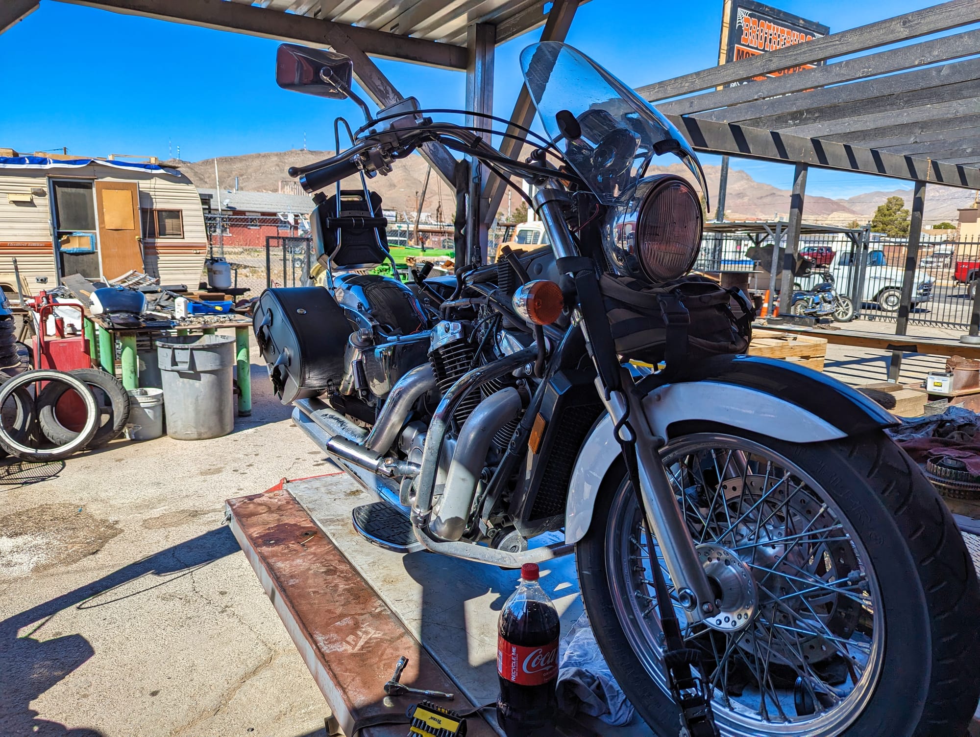 Doug's bike is with Danny to have the tank shipped off for a custom paint job: letters down each side, reading 'Siempre Luchando.' Always Fighting.