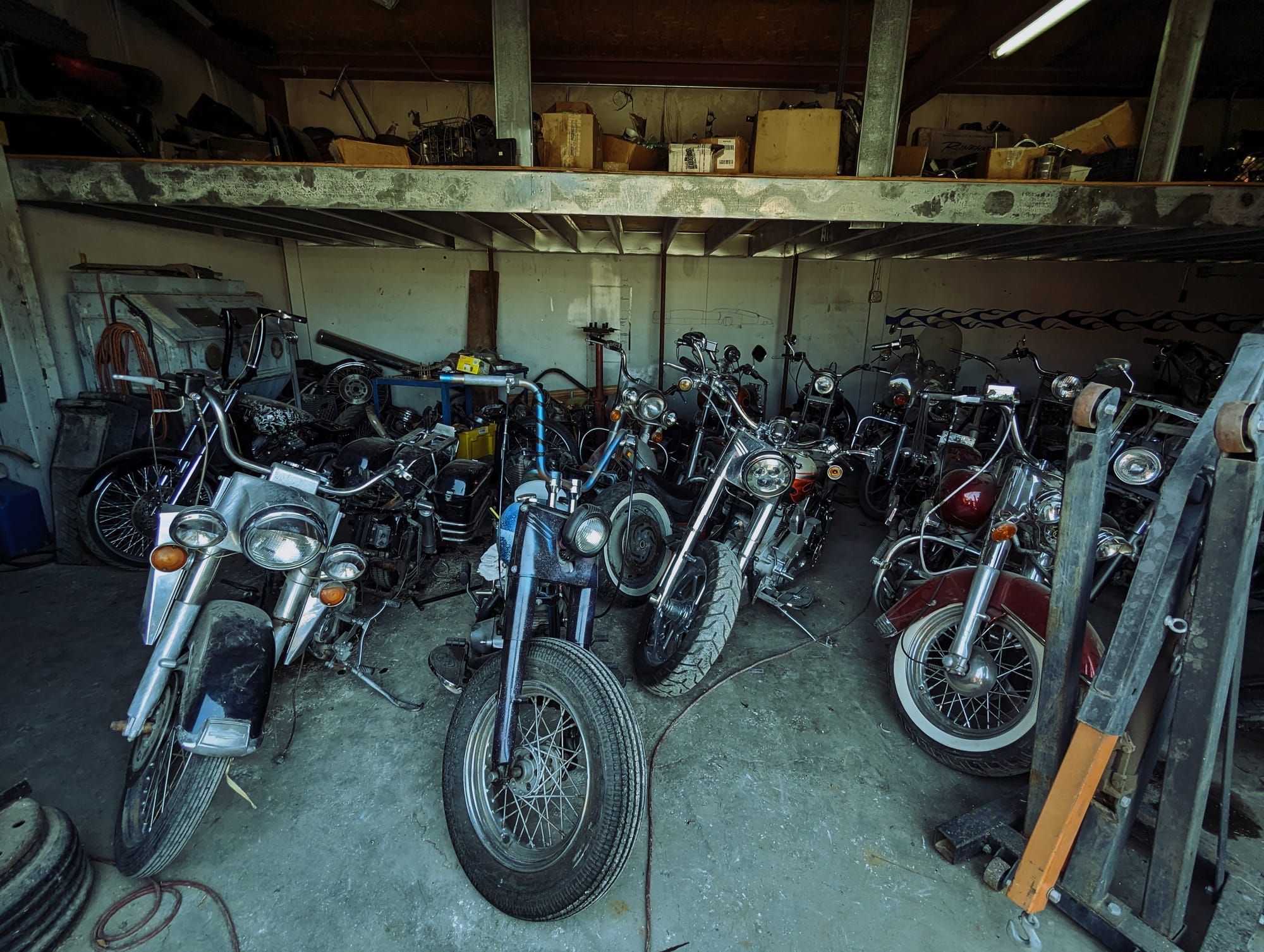 In the dark interiors of the shop's several interconnected garages fifty or so bikes languish in various states of undress, their skeletal frames mummified in thick layers of pale orange dust. In the light of a headlamp spindly handlebars cast long, grasping shadows like outstretched limbs, victims of some forgotten cataclysm frozen in eternal lamentation.